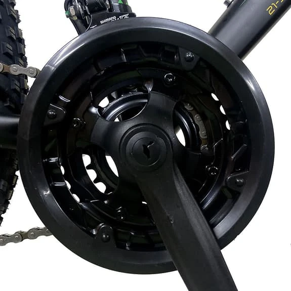 La suspension Rigide absorbera et adoucira les impacts du vélo sur les terrains irréguliers (nids de poule, creux, bosses…) aussi bien sur les chemins que sur la route. Avec un dérailleur Shimano 21 vitesses, une suspension avant, des pneus de 24 x 3, un frein à disque mécanique, des jantes en aluminium, un cadre en acier robuste Hi-Ten, des réflecteurs pour la visibilité et une béquille.